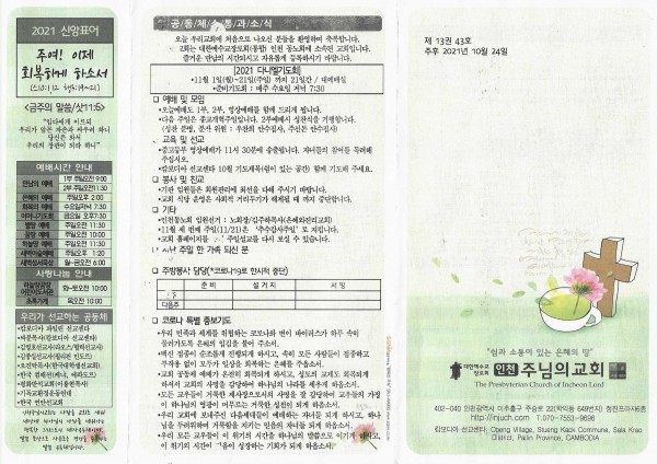 2021-10-24 공동체 소통과 소식 / 비대면 예배 작성자 섬김이 작성일21-10-30 01:24 조회382회 댓글0건 관련링크 목록 본문 코로나로 인하여 비대면 예배와 겸하여 드립니다. 댓글목록 등록된 댓글이 없습니다. 목록